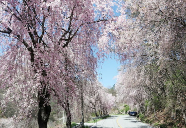 경상남도 거창군 북상면 병곡리에 위치한 수양벚꽃길은 약 2km 길이로 늘어진 수양벚나무가 만들어내는 풍경이 마치 벚꽃 커튼처럼 흐드러집니다.